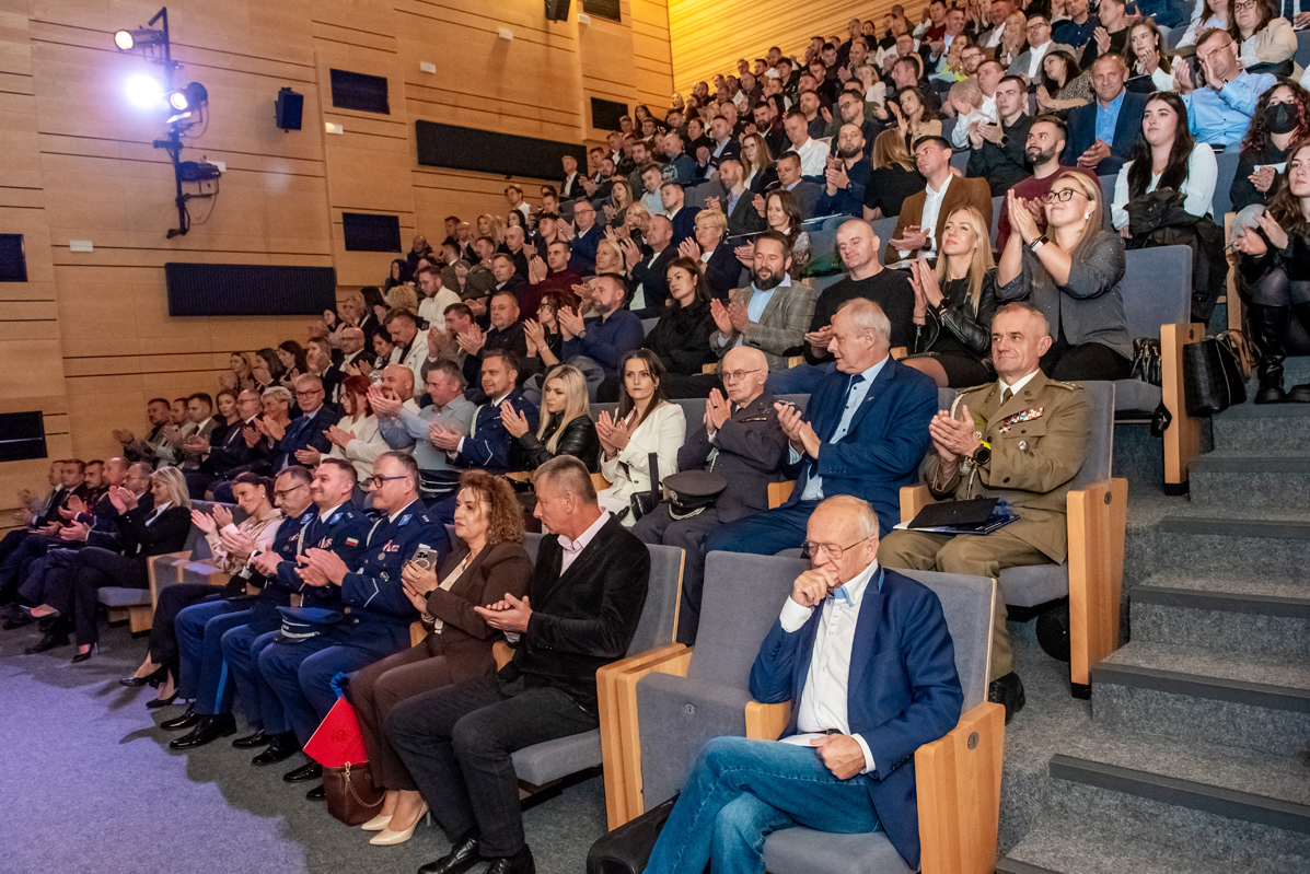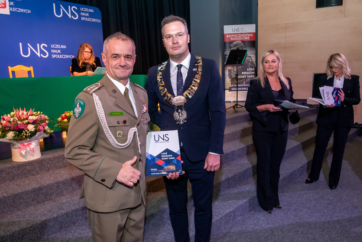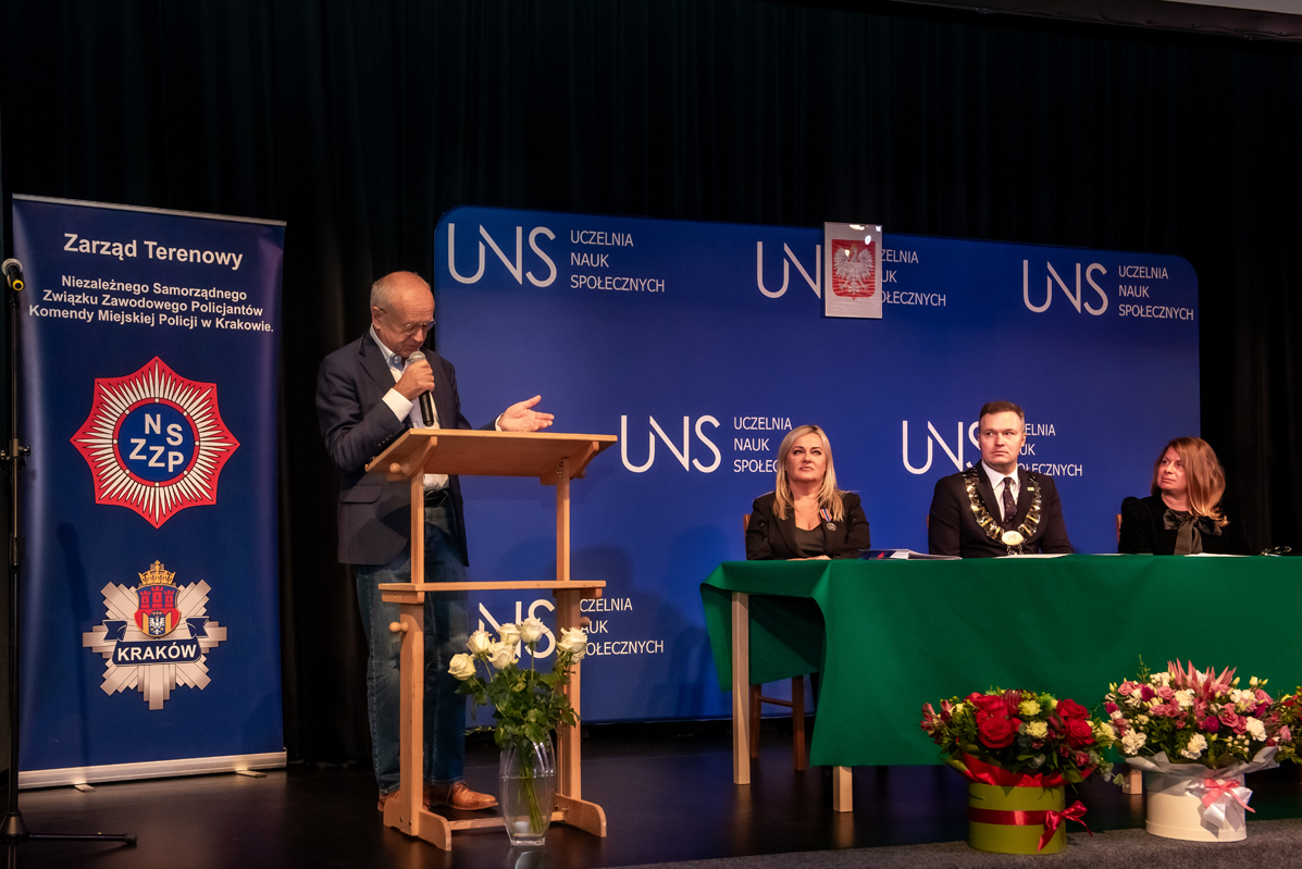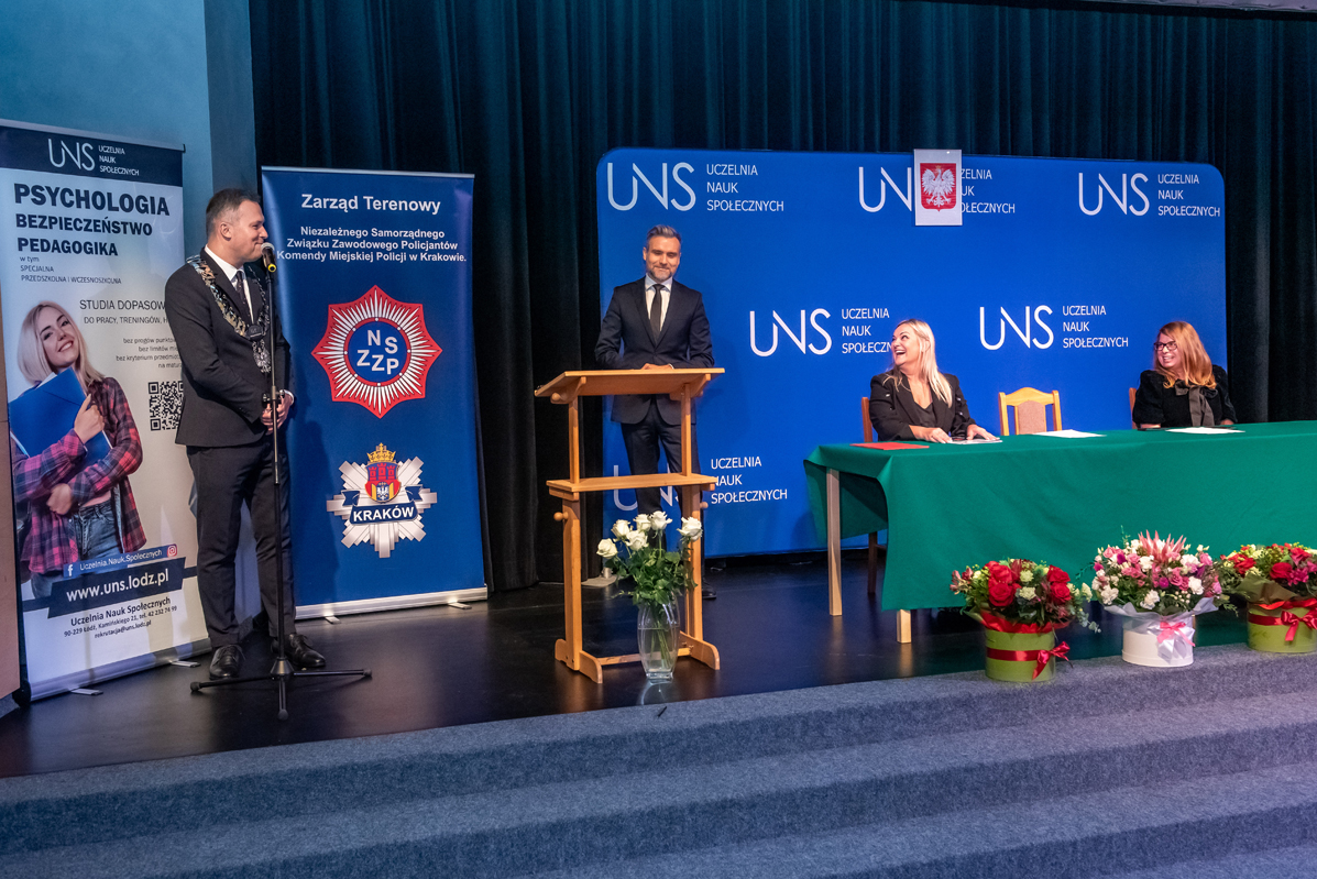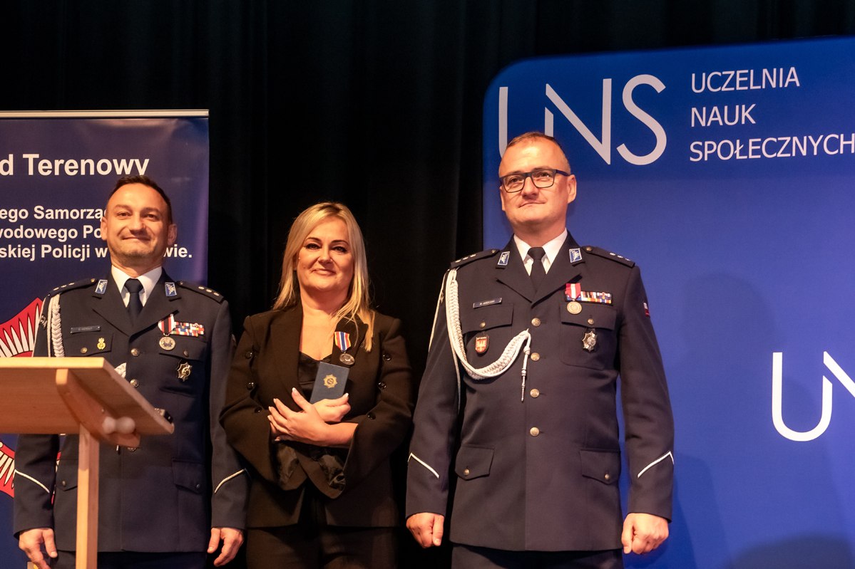 Szczególnym i wzruszającym momentem uroczystości było również wręczenie medalu przez przedstawicieli związków zawodowych: komisarza Dawida Herbuta oraz komisarza Mariusza Juszczaka. Z rąk wręczających medal, w uznaniu zasług na rzecz bezpieczeństwa, w imieniu Władz #UNS odebrała Pani Prorektor dr Anetta Łatak, MBA.